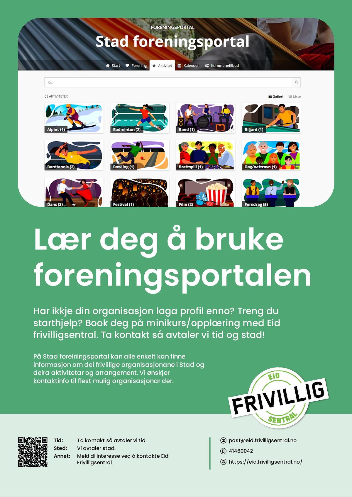 Dette er eit tilbod til alle frivillige organisasjonar som føler dei treng litt hjelpe til å kome igang med å marknadsføre seg på Stad Foreningsportal og/eller treng hjelp til å bruke Tilskuddsportalen. Ta kontakt med Eid Frivilligsentral og book eit lite minikurs i foreningsportal/tilskuddsportal. Vi avtaler tid og stad som passar deg. Det er sjølvsagt heilt gratis. Kontakt Frivilligsentralen på tlf. 41460042, eller på epost: post@eid.frivilligsentral.no .Del på: